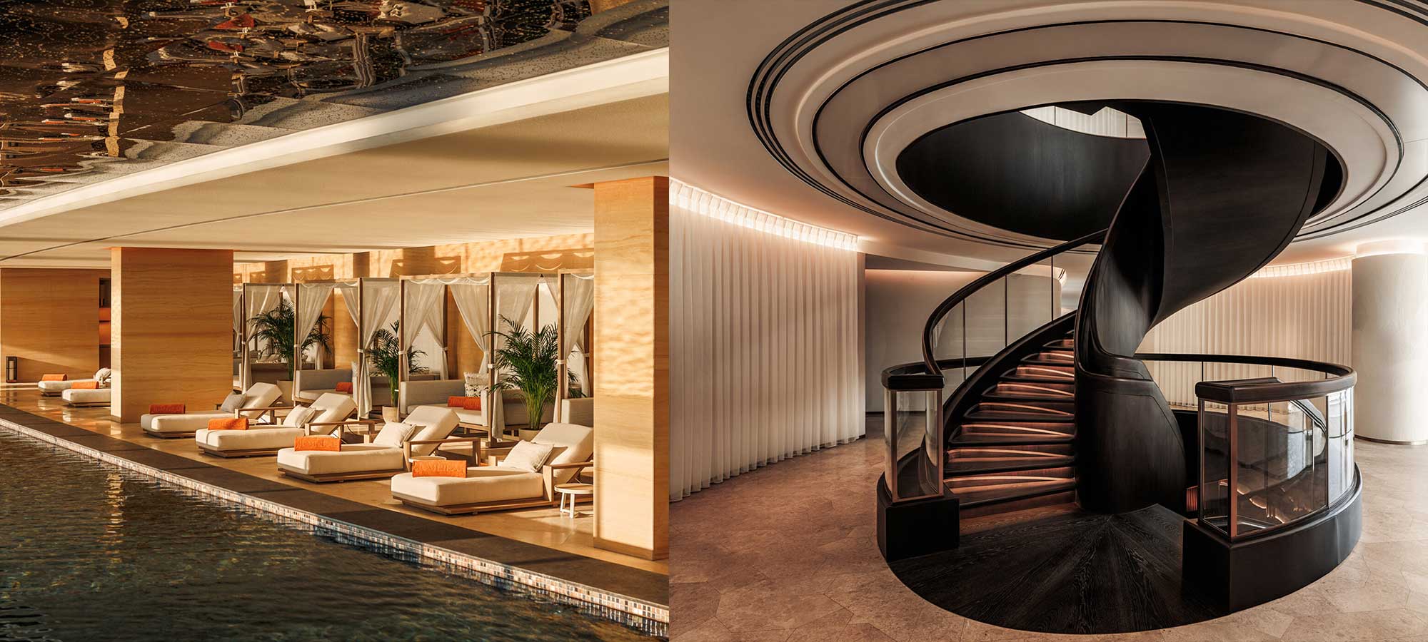 Finished in bronze with glowing white marble steps, a heroic spiral stair serves as a grand theatrical entrance to the event space.